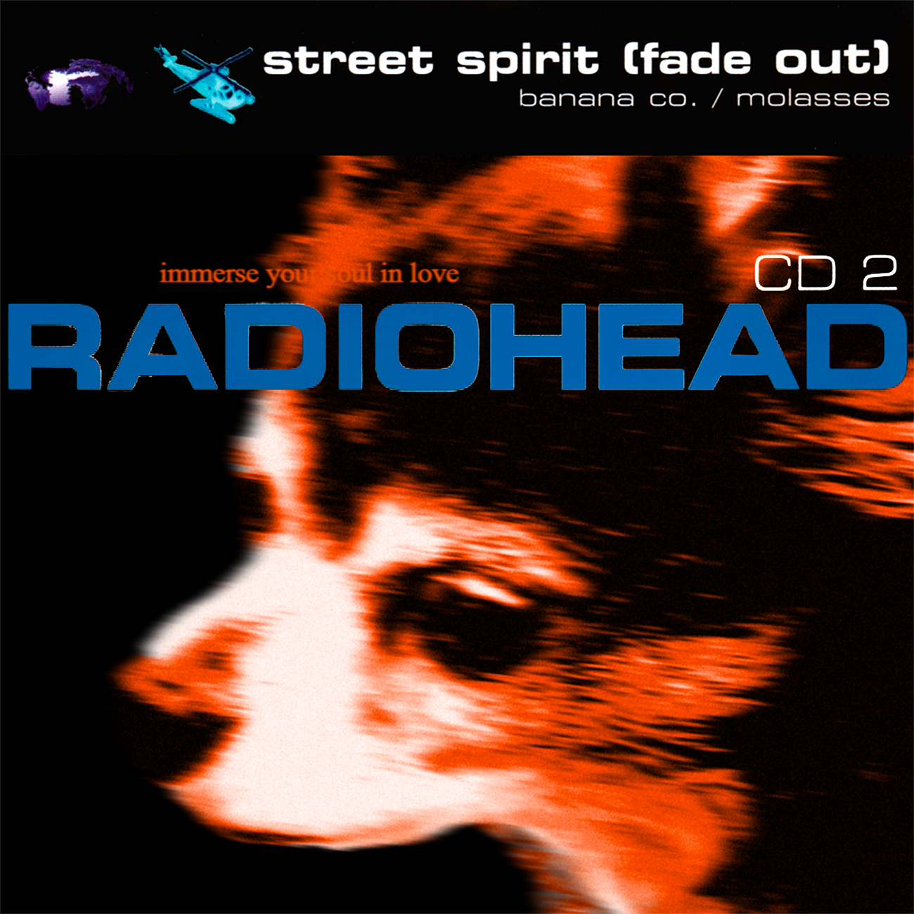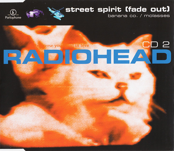 An image of a dog is used to recreate the cat on the cover of Radiohead's Street Spirit CD2.